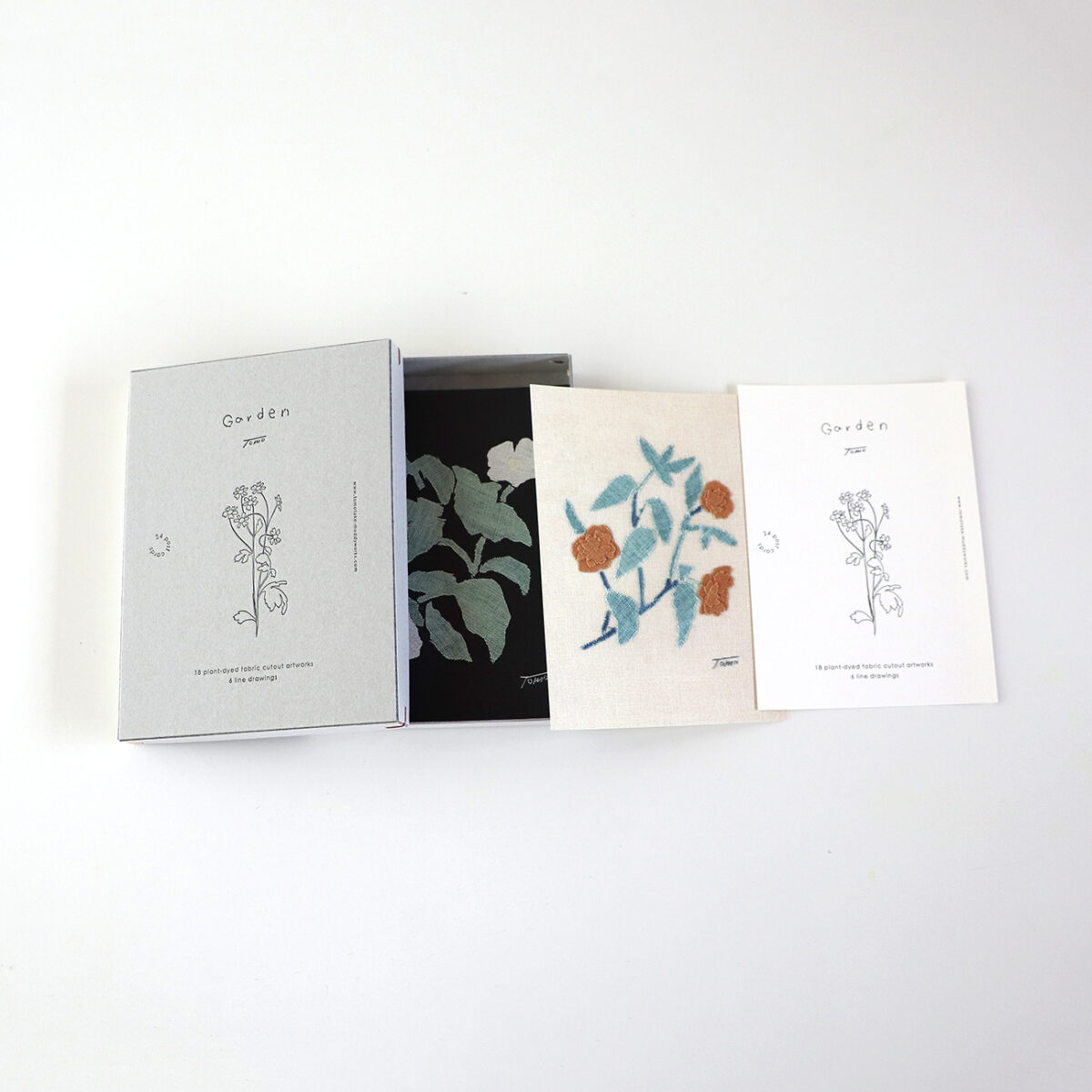 本展では、「Garden」をテーマに、草木染の布で制作した、春らしく彩りのある花の切り絵作品と、それらの作品を集めた箱入りのポストカードセット、庭に集まる様々な毛色の猫のクッション、新作の猫の原画をプリントしたFANTASTIC CATシリーズやTomotakeがデザインを手がけるMUDDY WORKSのテキスタイルで作ったハンカチなどもご紹介いたします。